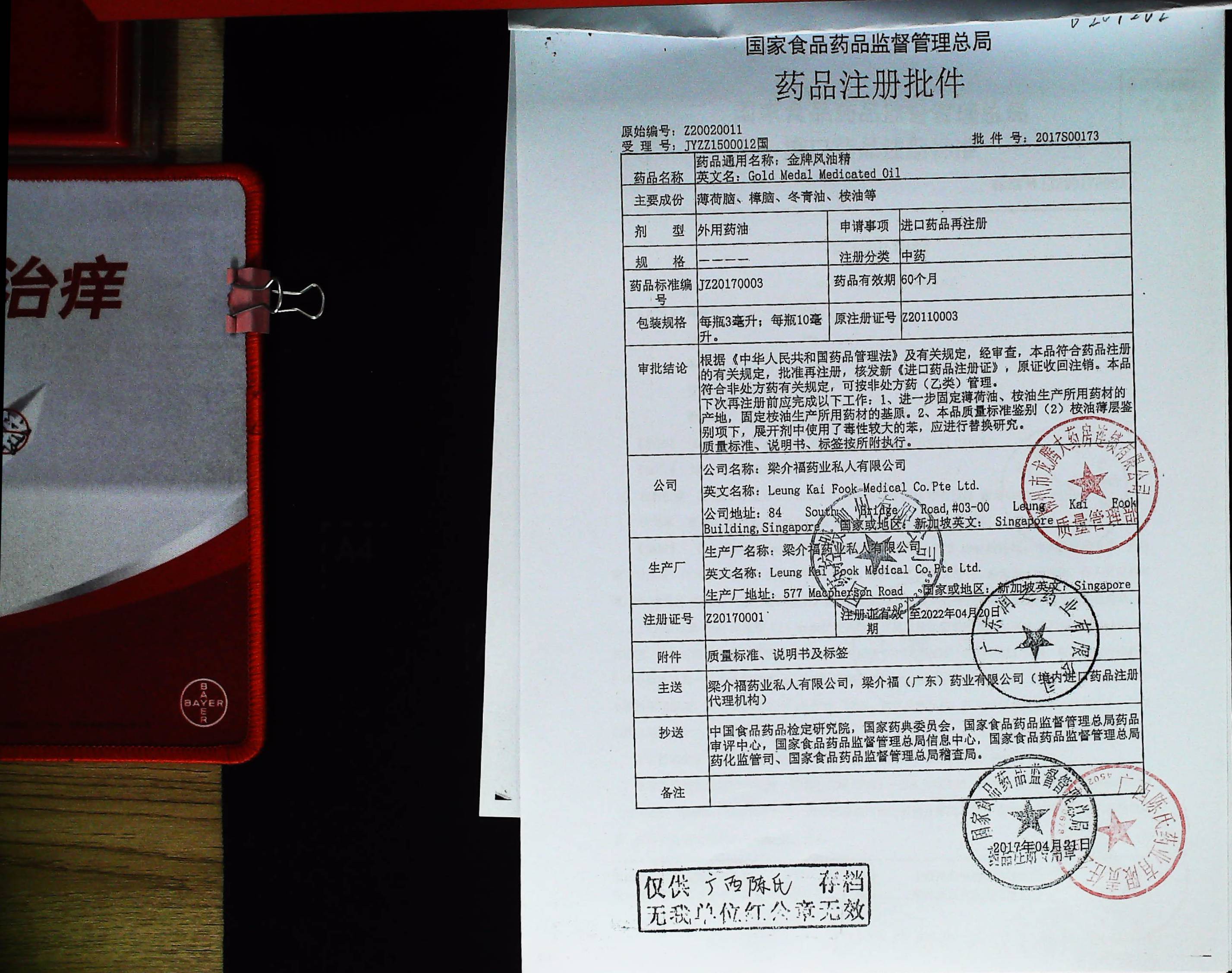 金牌风油精进口药品注册证号Z20170001